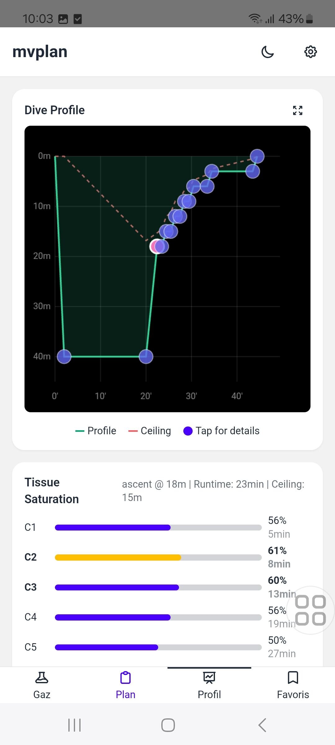 • Interactive visual dive profile with ceiling overlay and tissue saturation display